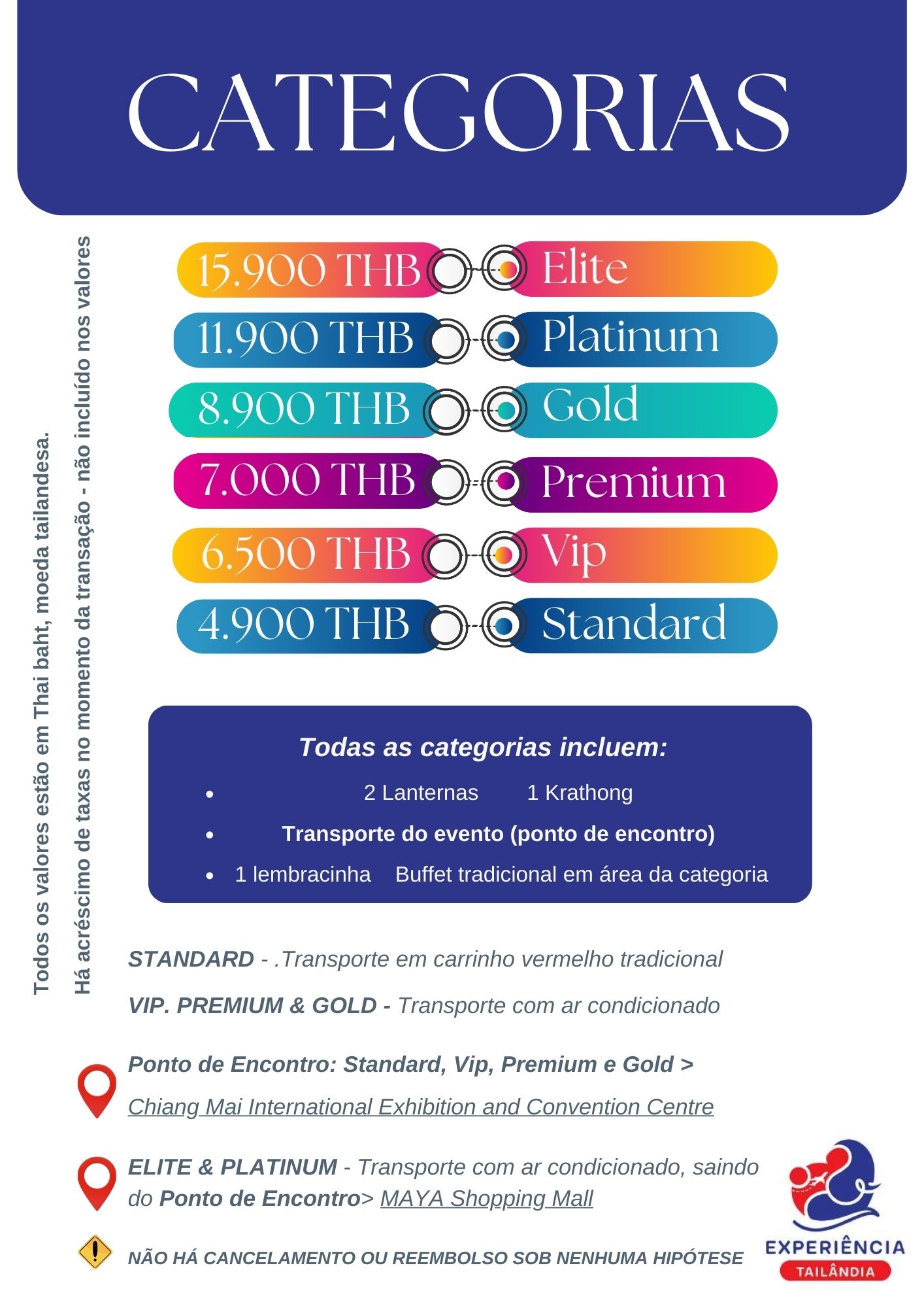 Ingresso para o Festival das Lanternas 2026 – Categoria Elite custa 15.900 baht, o que equivale a aproximadamente R$ 2.639, considerando a cotação média de 03/02 (1 baht = R$ 0,16).