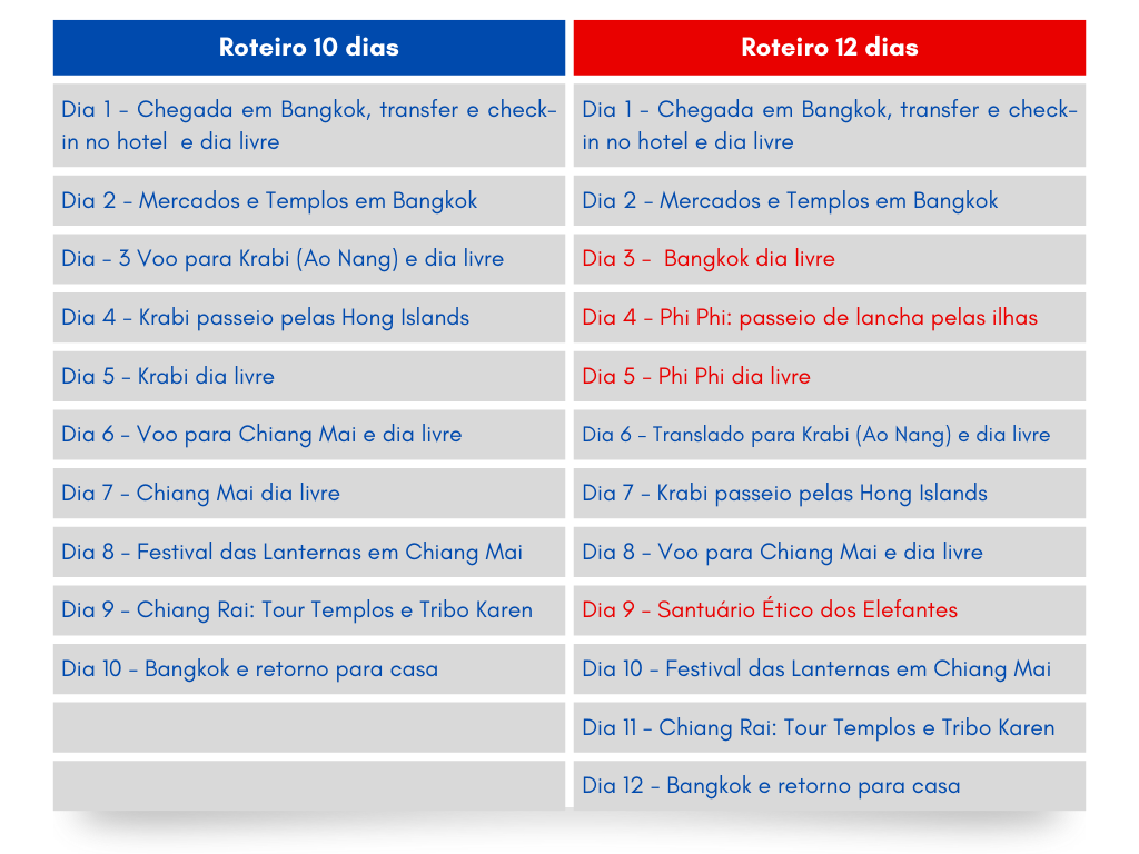 A principal diferença entre os dois roteiros está no ritmo e na profundidade da experiência, especialmente nos dias destacados em vermelho no roteiro de 12 dias. Enquanto o roteiro de 10 dias é mais direto e concentrado, o de 12 dias adiciona um dia livre extra em Bangkok, inclui Phi Phi e distribui melhor o sul da Tailândia antes da subida para o norte.
