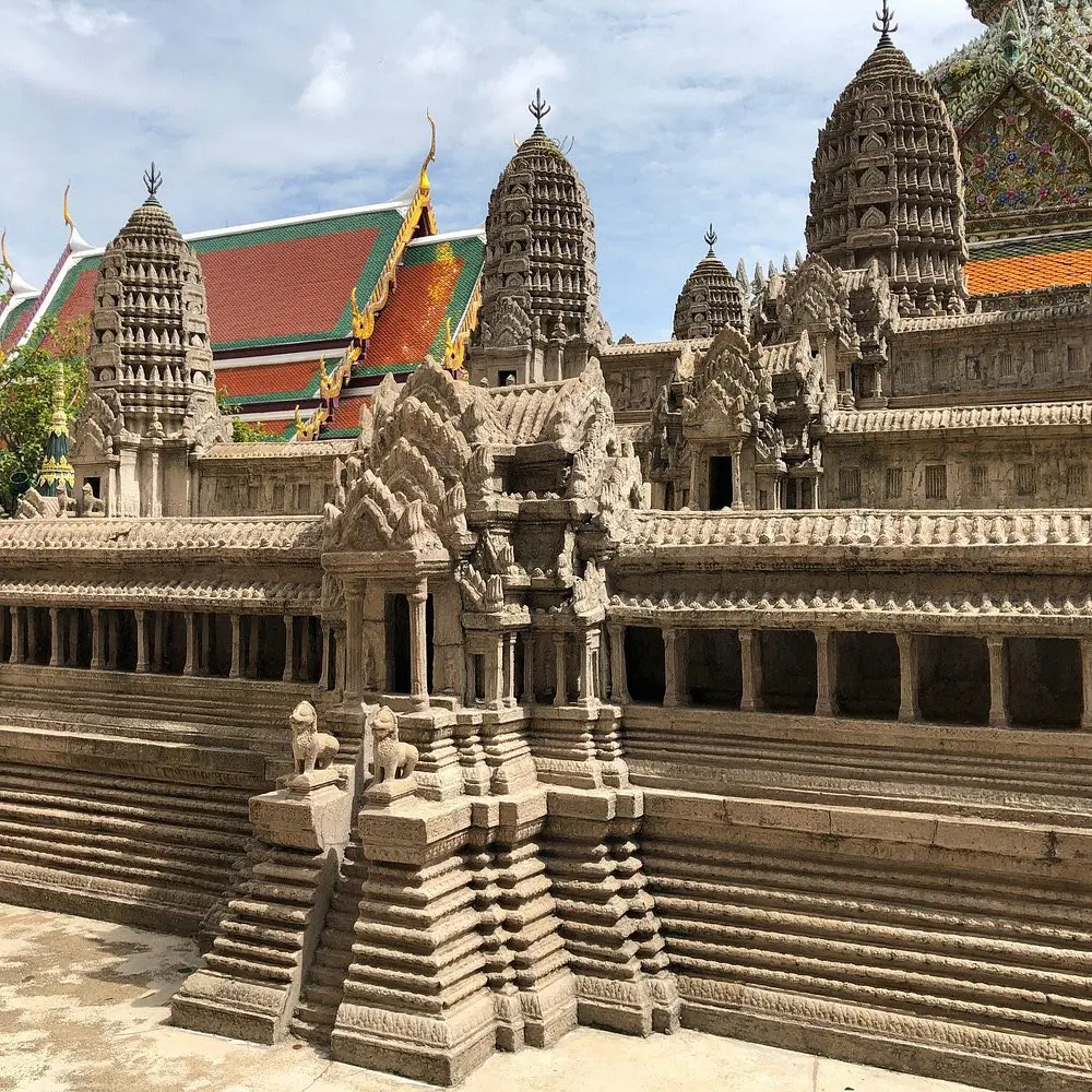 Ainda pelas curvas e pátios do Grand Palace, é possível fazer uma breve visita ao Camboja sem sair da Tailândia. Foi durante o reinado de Rama IV que surgiu a ideia de construir uma réplica em escala reduzida de Angkor Wat, originalmente erguido no século XII, no Camboja. Na época, chegou-se a considerar a transferência de um templo khmer original para Bangkok, mas a solução adotada foi a criação dessa miniatura arquitetônica, construída em concreto. A obra foi concluída no reinado de Rama V e hoje funciona como um registro das conexões históricas e culturais entre os reinos do Sudeste Asiático.