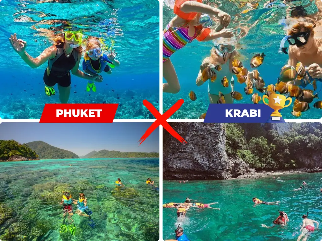 As ilhas próximas, como Hong, Chicken e Koh Poda, tem águas cristalinas e recifes de coral de fácil acesso, e são o destino favorito de quem vem para a Tailândia observar a vida marinha de Snorkel. Em Phuket, os melhores pontos estão mais distantes, como as Ilhas Similan, que exigem um trajeto mais longo de barco.