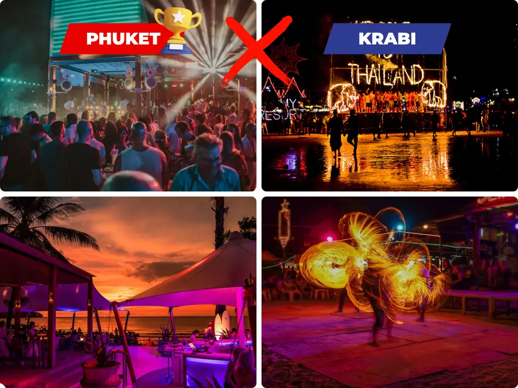 Krabi é mais tranquila, com bares de coquetéis e música ao vivo em Ao Nang e Railay, algumas festas a beira mar e show de fogos na areia.