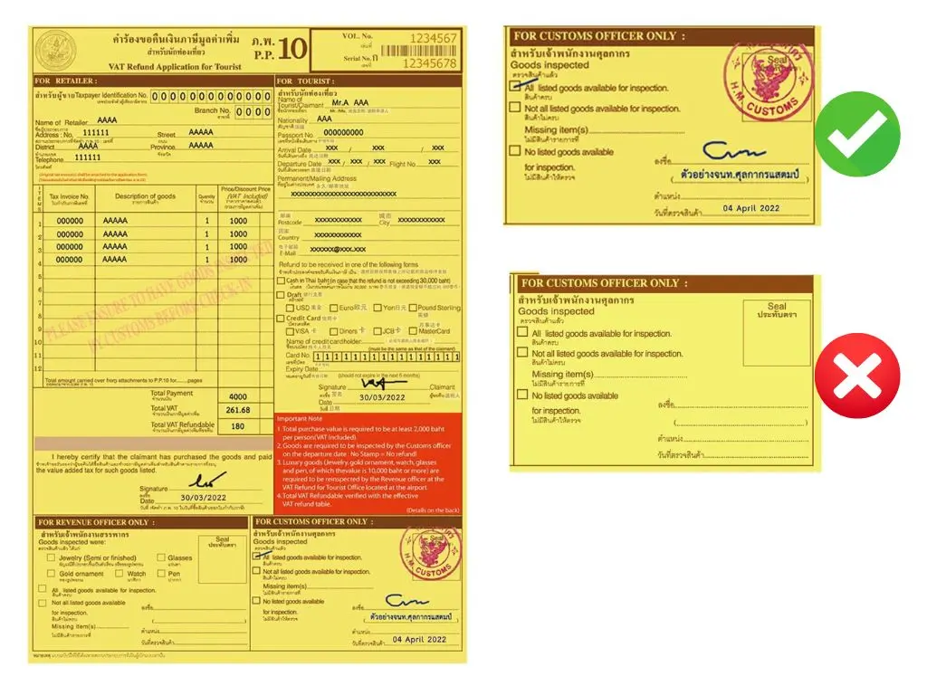 No guichê de Reembolso de IVA (VAT Refund), após a imigração, você apresenta o formulário P.P.10 carimbado, as notas fiscais originais e o passaporte. Para artigos de luxo com valor a partir de 10.000 THB por item, mantenha-os em fácil acesso, pois podem ser solicitados para conferência. Isso inclui joias, relógios, óculos, canetas e eletrônicos como celulares, laptops e tablets.